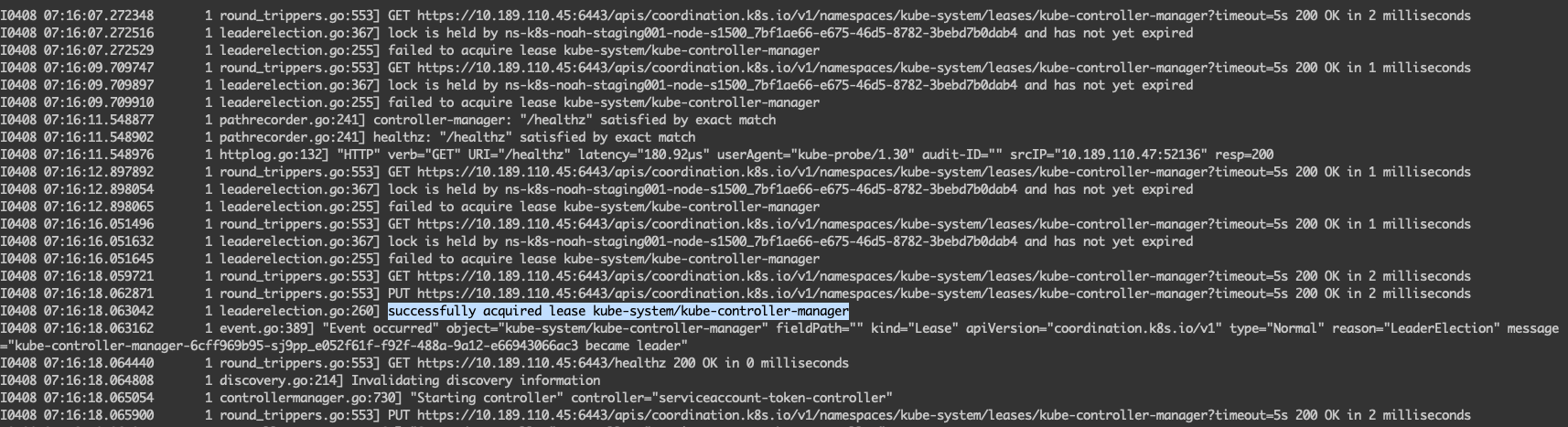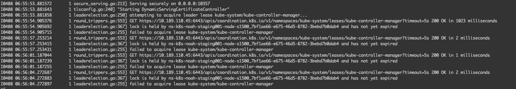 然后我们在控制节点上,将原来的 kube-controller-manager 的 Static Pod 删除掉,新的 Deployment 的 Pod 就会自动选主,成为新的主节点。