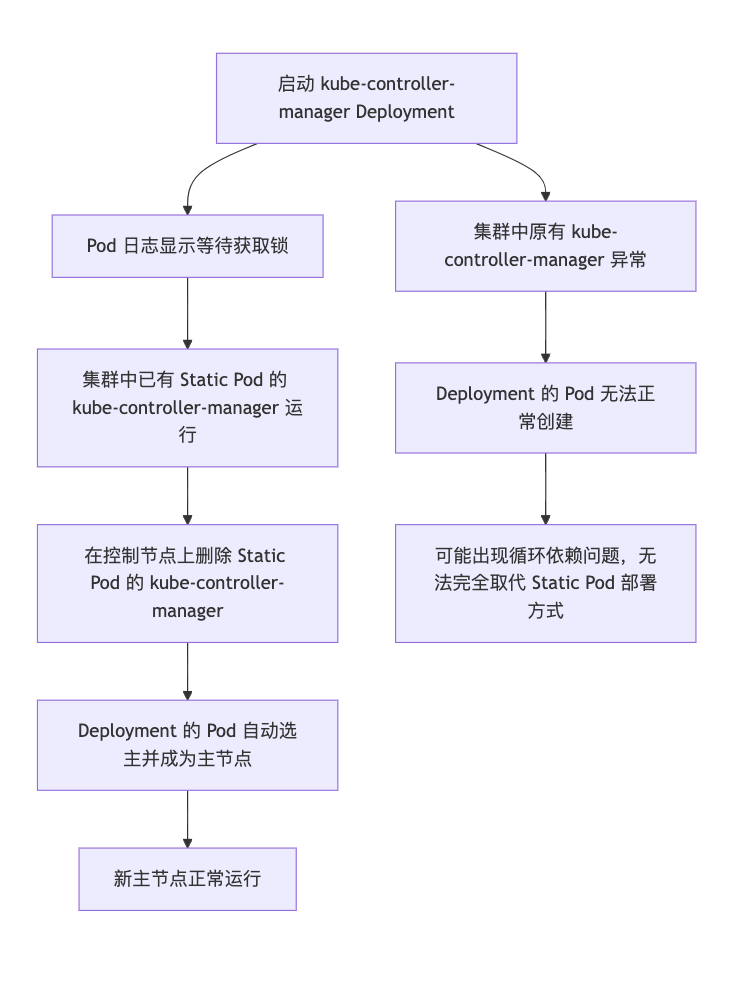 因为当前是考虑用 Deployment 来部署 kube-controller-manager,如果在创建 Deployment 之前,集群中原有的 kube-controller-manager 出现异常,会导致新的 Deployment 是无法正常创建出来的,因此 Deployment 的方式并不能完全取代 Static Pod 的方式,因为有潜在循环依赖的问题。
