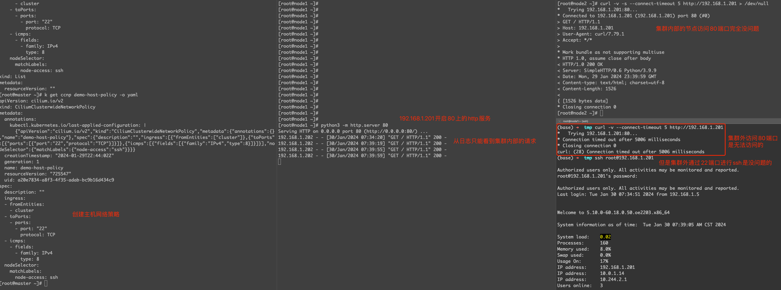 分别做以下的测试,可以见到主机上的网络策略是生效的。