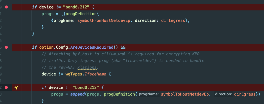 代码修改的部分如下,从代码的逻辑看,暂时通过 hard code,使得 cilium-agent 在判断是否给网卡加载 eBPF 程序的时候,会跳过我们的目的网卡 bond0.212,重新编译之后就可以放在 cilium-agent 的容器内运行了。
