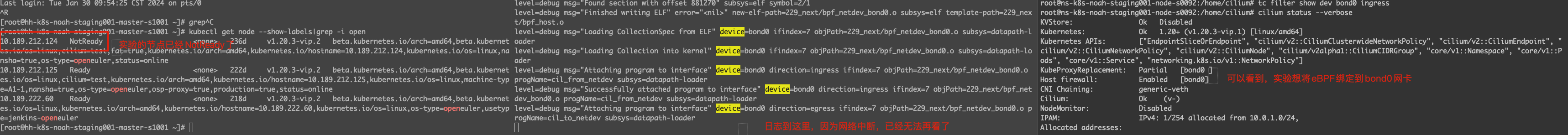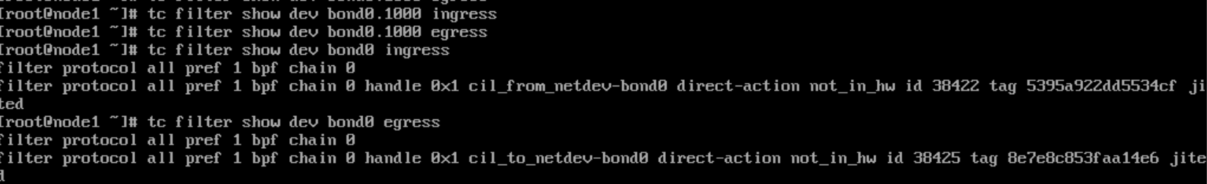 果然按照之前的部署方式,node1 和 node2 节点都无法访问了,下面我们通过服务器的管理卡登录服务器进行 debug。可以看到 bond0 上是已经挂载了 eBPF 程序,另外 bond0.1000(这个服务器的vlan子接口)上已经没有挂载 eBPF 程序了。