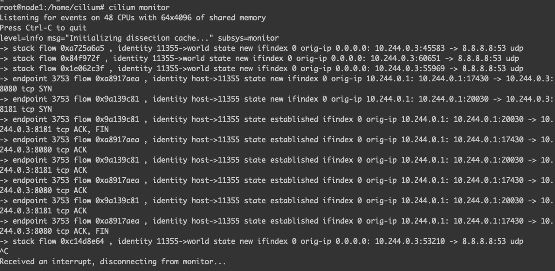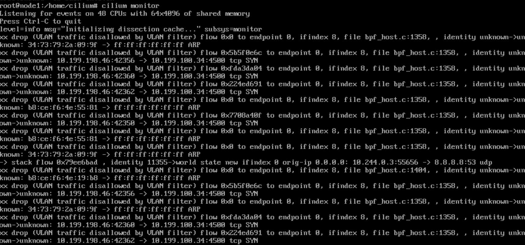 那么到底是什么原因导致 bond0 的流量被阻挡了呢?下面进入到 cilium-agent 的容器内,通过 cilium monitor