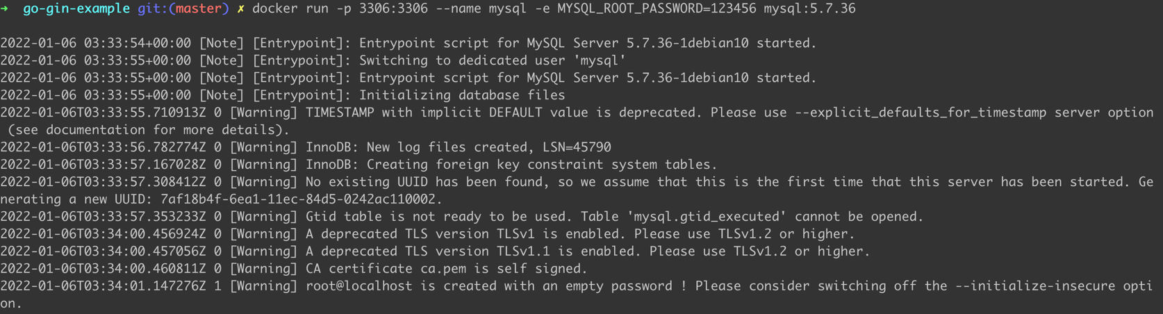 docker run -p 3306:3306 --name mysql -e MYSQL_ROOT_PASSWORD=123456 mysql:5.7.36