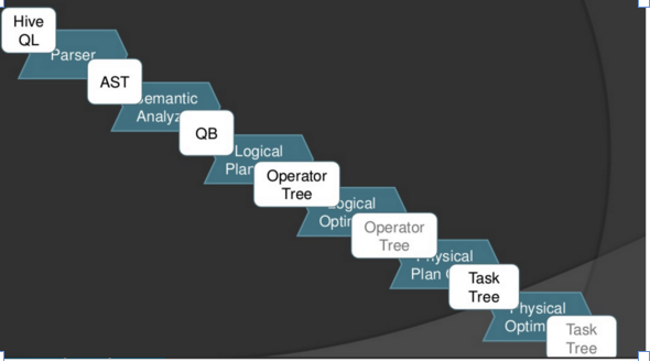 SQL Parser:Antlr定义SQL的语法规则,完成SQL词法,语法解析,将SQL转化为抽象 语法树AST Tree; Semantic Analyzer:遍历AST Tree,抽象出查询的基本组成单元QueryBlock; Logical plan:遍历QueryBlock,翻译为执行操作树OperatorTree; Logical plan optimizer: 逻辑层优化器进行OperatorTree变换,合并不必要的ReduceSinkOperator,减少shuffle数据量; Physical plan:遍历OperatorTree,翻译为MapReduce任务; Logical plan optimizer:物理层优化器进行MapReduce任务的变换,生成最终的执行计划;