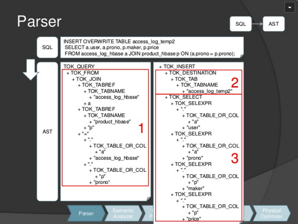 step1: SQL Parser 如下图所示, sql语句可以解析为三个部分 AST中第一个部分对应SQL语句中FROM access_log_hbase a JOIN product_hbase p ON (a.prono=p.prono)。 insert overwrite table对应第二部分。 select a.user, a.prono, p.maker, p.price对应第三部分。