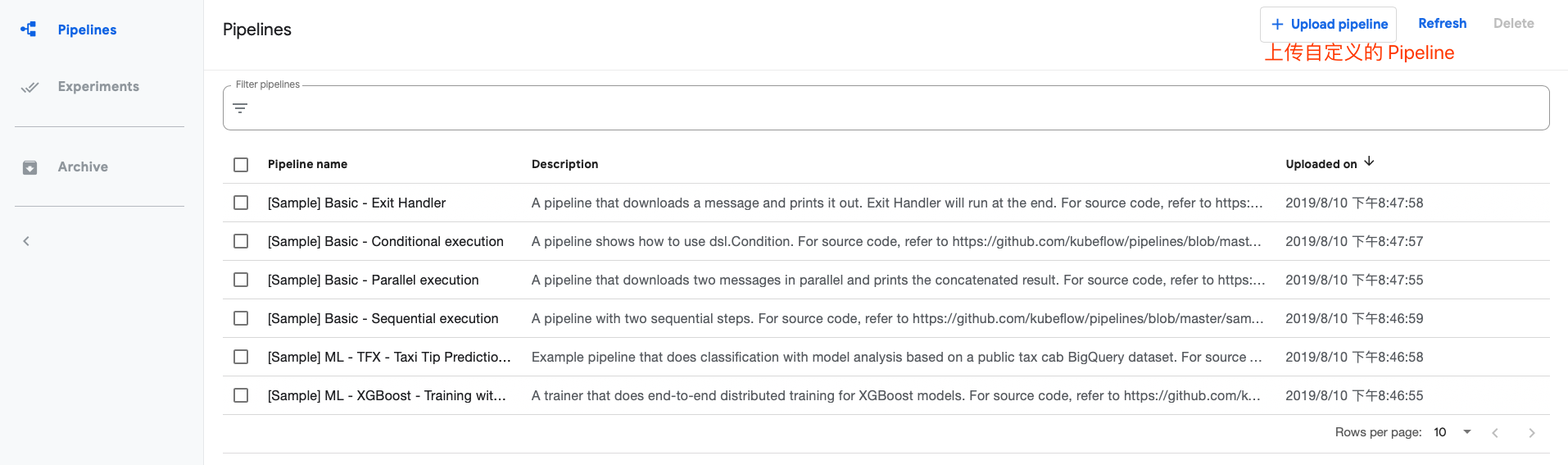 Pipeline 提供了几个内置的 Pipeline……有点绕口,但是真正使用的时候,但是默认提供的几个 Pipeline 都要基于 GCP Google 的云平台,但是我们的目的是在自己的集群部署,自然是访问不到 GCP 的,所以根据官网,总结了一些构建 Pipeline 的流程。