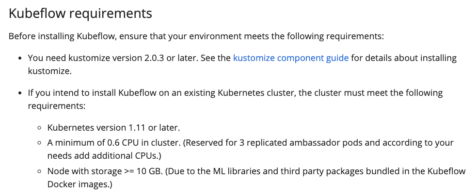 安装条件,可以在 Kubeflow requirements 找到,具体贴出来,因为版本不同,以及 K8S 一些自定义配置会对部署造成影响。