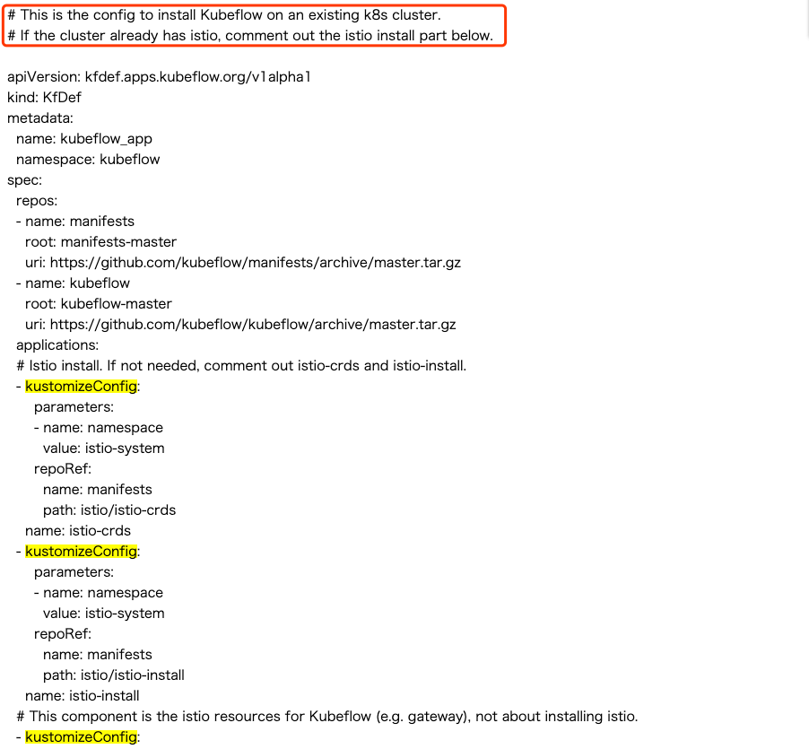# Installs istio by default. Comment out istio components in the config file to skip istio installation. See https://github.com/kubeflow/kubeflow/pull/3663