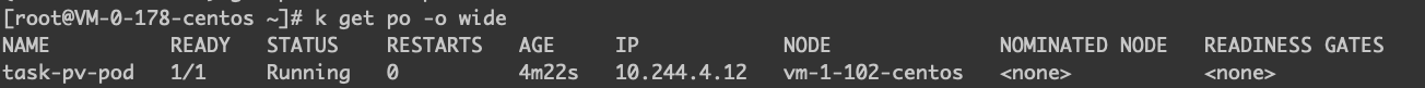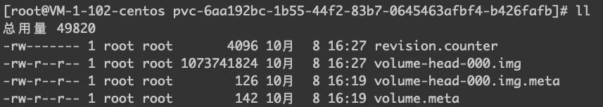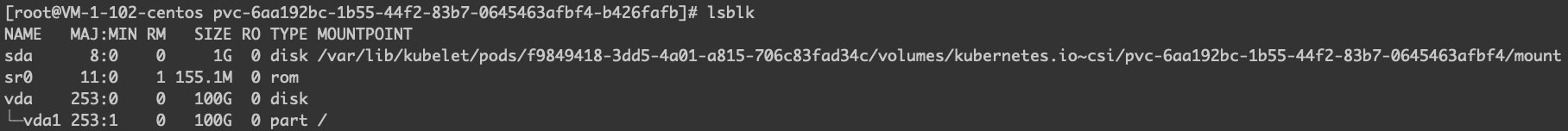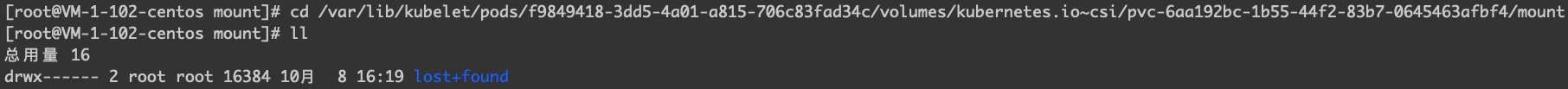 可见 Pod 目前是调度在 vm-1-102-centos 这台机器上,从这台机器的几个命令确认,卷是 mount