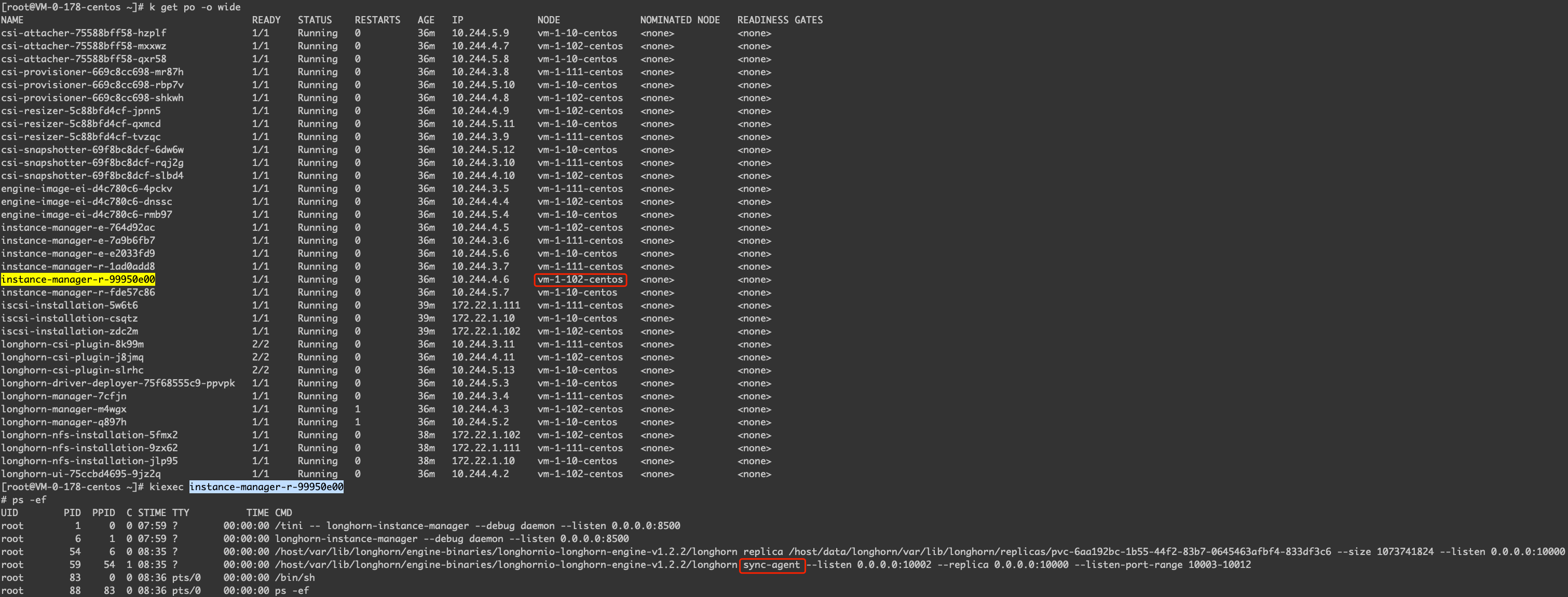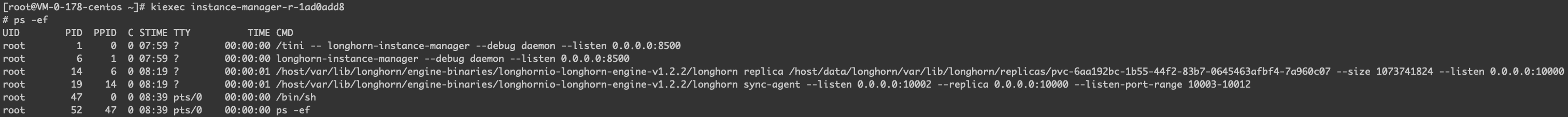 两个副本会在 instance-manager-r 的 Pod 里有体现,如下图,可以看到这个 Pod 里的进程除了有一个 replica 的进程,还会有一个 sync 的进程,负责两个 replica 之间的数据同步。