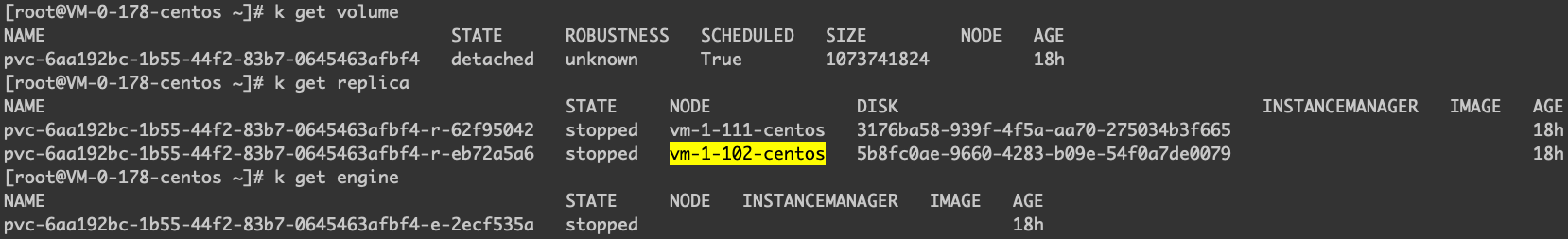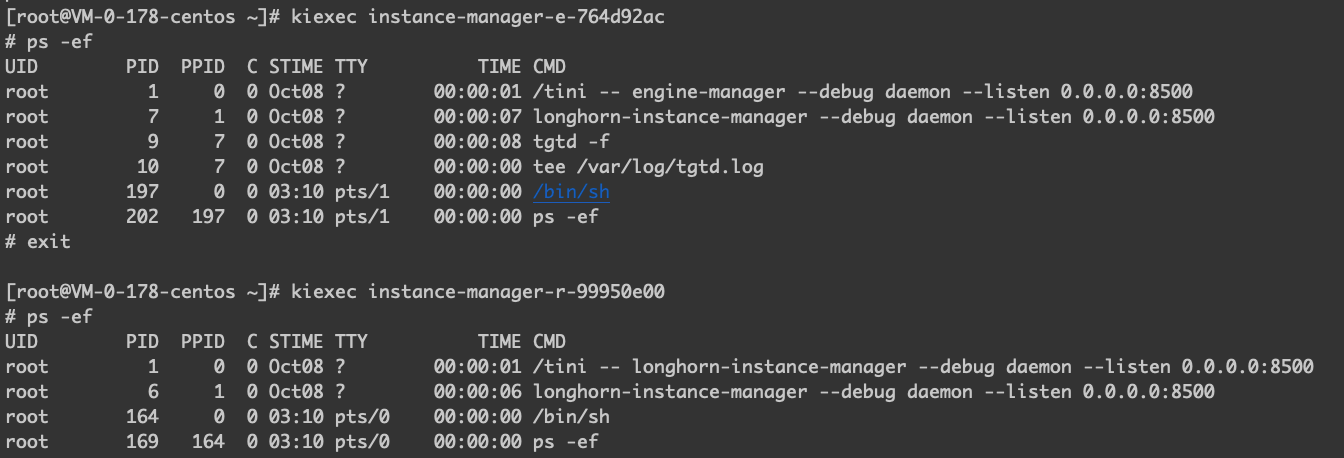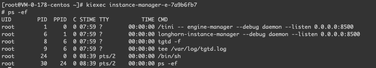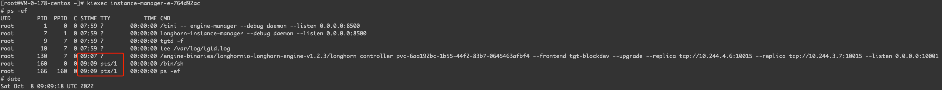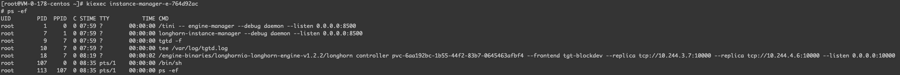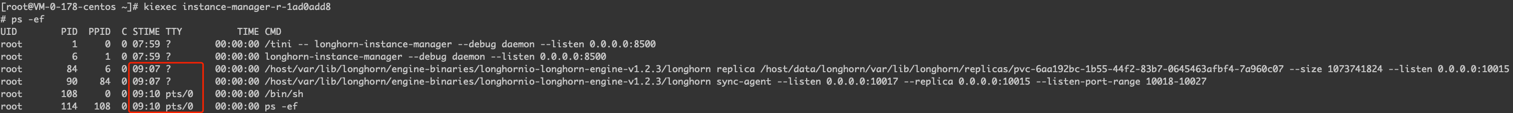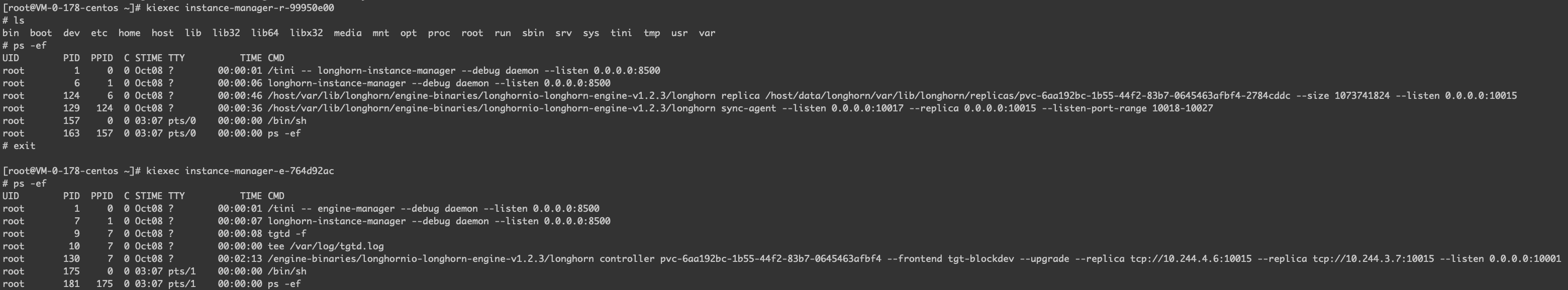 删除这个卷之后,查看一下 instance-manager-e 和 instance-manager-r 内的进程的变化。可以看到关于 replica 和 engine 的进程都停止了。