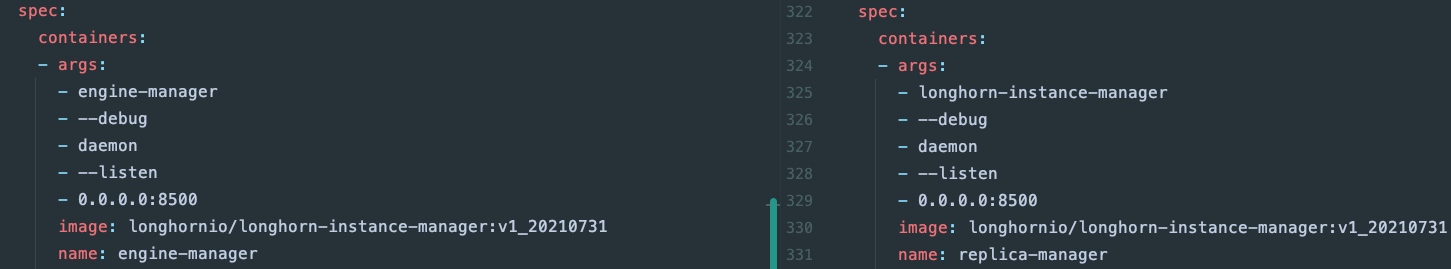 Longhorn Instance Manager 说的很清楚了,他是负责管理 engine/replica 实例的组件,他实际是一个 cli 工具。在 Longhorn 的部署中,会以单个 Pod 出现 instance-manager-r。下面看一下 instance-manager-r 这种类型的 Pod 的定义。