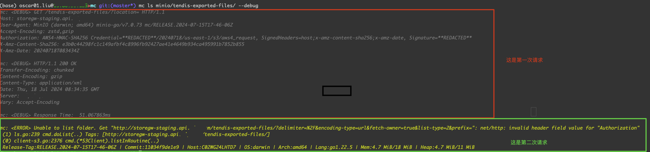 先说结论,本质原因是 X3 没有实现 API_GetBucketLocation S3 这个标准接口,Minio Go SDK 通过 s3v4 访问对象存储的时候,比如 ListObject 实际会发送两次请求,第一次请求会先发查看 Bucket 的 Location 信息的接口,根据 Response 拿到 Location 字段,并且 Location 字段会作为第二次请求 ListObject 的签名 Header 重新签名发送的请求。
