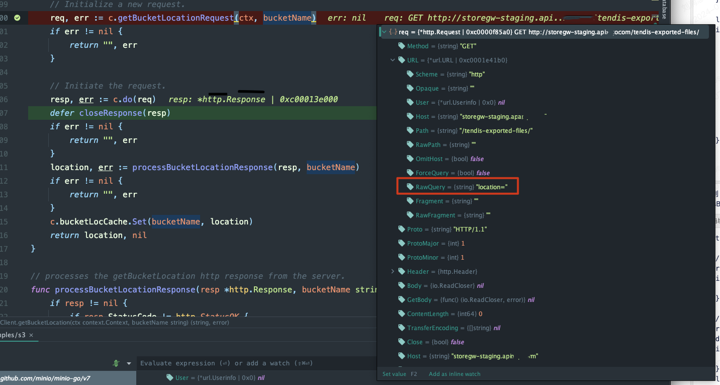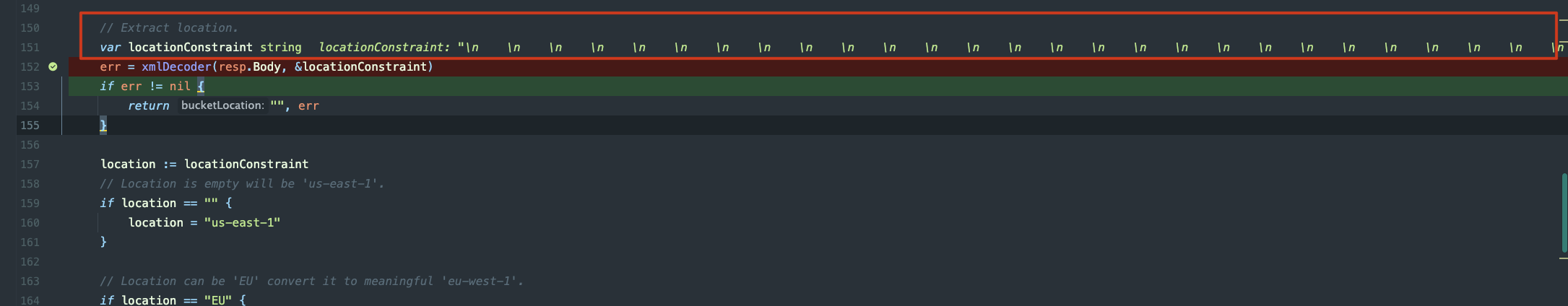 可以想象,如果 Minio Go SDK 拿着这个 Response 去解析 Location 肯定是无法正常解析的,在下面的 debug 过程里可以验证,解析出来的是一堆换行符!