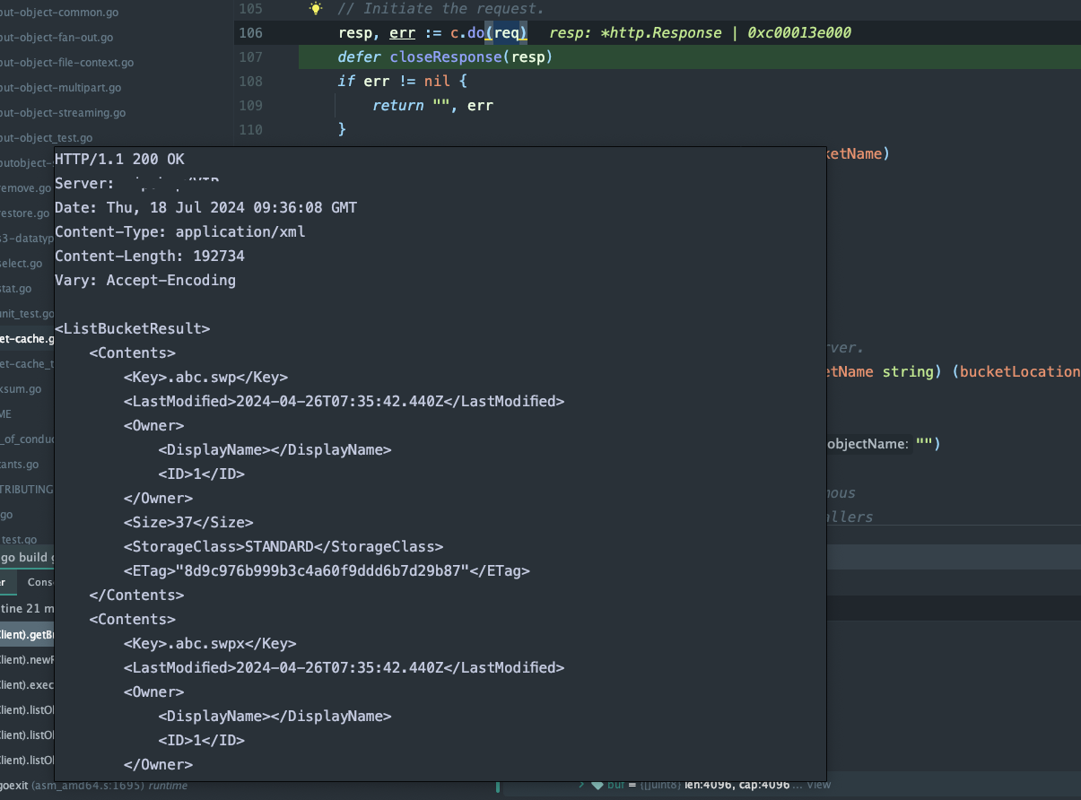 因为 X3 没有实现这个接口 API_GETBucketLocation,因此实际请求发送到 X3 中,会被 GetBucket 接口处理(或者其他接口),而这个接口返回的内容中没有 Location 字段!!但在 Minio Go SDK 中仍然会通过 XML 的 Decoder 去解析 Response,这样就会返回一个不正常的结果,Location 会变成换行符参与到签名中,而在 HTTP 的 Header 中是无法处理换行的,因此客户端在第二次请求的时候,会因为 Header 不正常,直接报错,请求甚至没有发送到 X3。