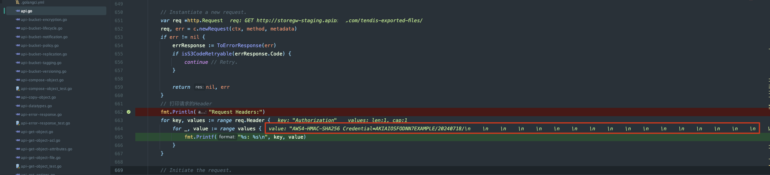 拿着一堆换行符去构建 Header 肯定是有问题的,这可以在 Minio Go SDK 里加几行日志去验证,很明显,这个头已经有大问题了。