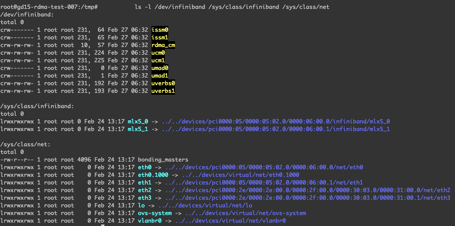 分别测试了 HostNetwork/Macvlan/SR-IOV 挂载 PF/VF 的基础测试,证明了容器在测试机器下,可以正常使用到这些 RDMA 设备。