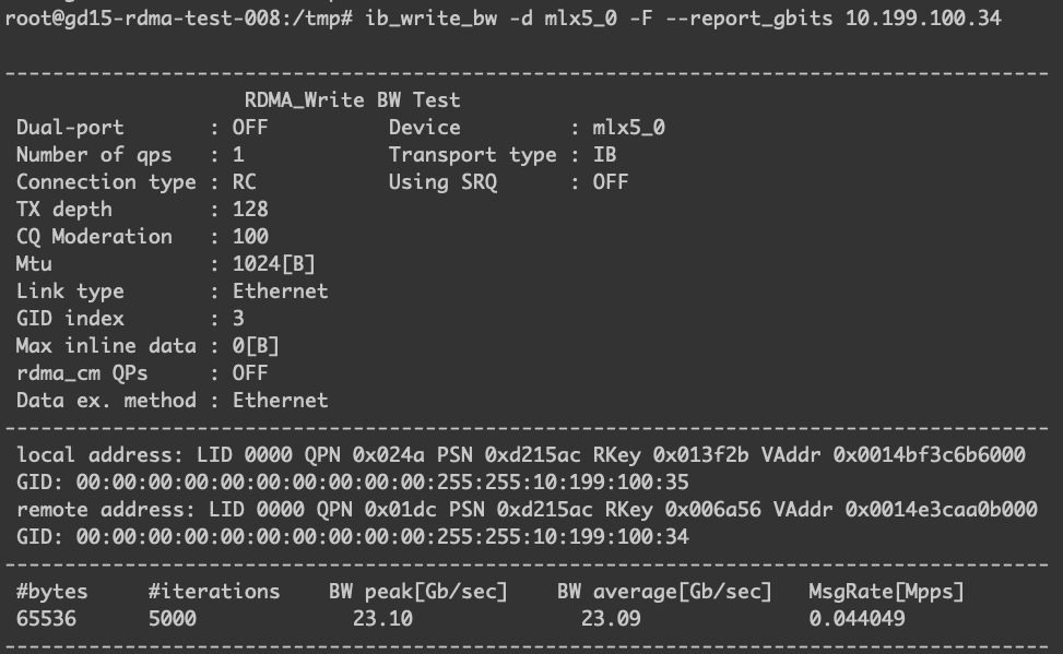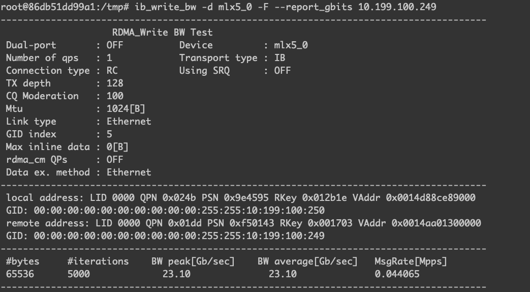 这里的测试目的是让不同主机上的容器分别挂载主机的网卡(PF),测试 OFED 容器的 ib_write_bw。