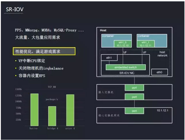 传统的 Bridge+VLAN 的方式相对 NAT 来说是有很大的提升,但是对于当时一些对网络质量要求非常高的业务和场景,比如游戏以及 MySQL Proxy 这样的组件,传统的网络方案无法达到业务的需求。以上是当时使用的 SR-IOV 模式,这种模式在 zen/kvm 虚拟化上用的比较多,游戏也需要这种高性能的网络方案,因此我们把这种网络方案也结合到 Docker 容器里面。
