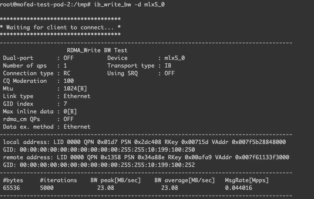 名为 mofed-test-pod-2 IP 为 10.199.100.250 的 Pod 是运行在节点 10.199.100.35 中的,作为测试过程中的服务端,如下图。