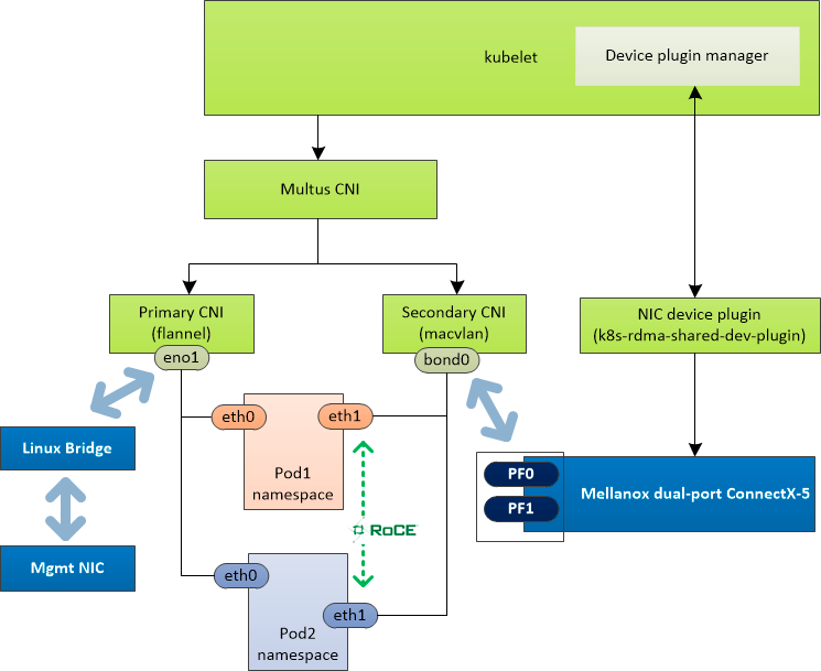 部署 Multus 是为了给 Pod 设置第二个网络平面,按照默认的部署方式,集群内网络是以 Flannel 为基础网络的,如果希望 Pod 可以有另外的数据网络,可以通过 Multus 来给容器创建第二个网络接口,下面的例子中,是通过 SRIOV 插件,并且分配一个 10.199.100.0/24 子网内的一个可用的 IP 来实现通信的。