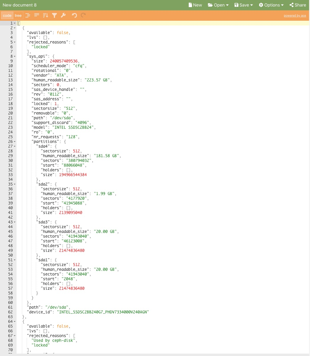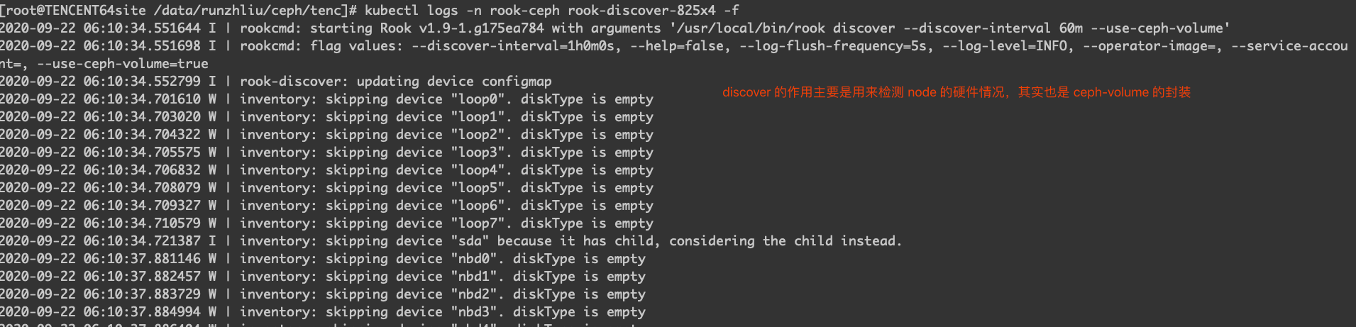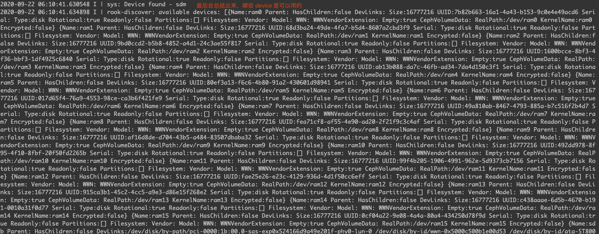 这些命令来做检查的,下面的命令即使 Rook 里用到的命令,在节点上执行一次看看结果,Rook 会根据一些条件来筛选合适的设备来启动 osd。