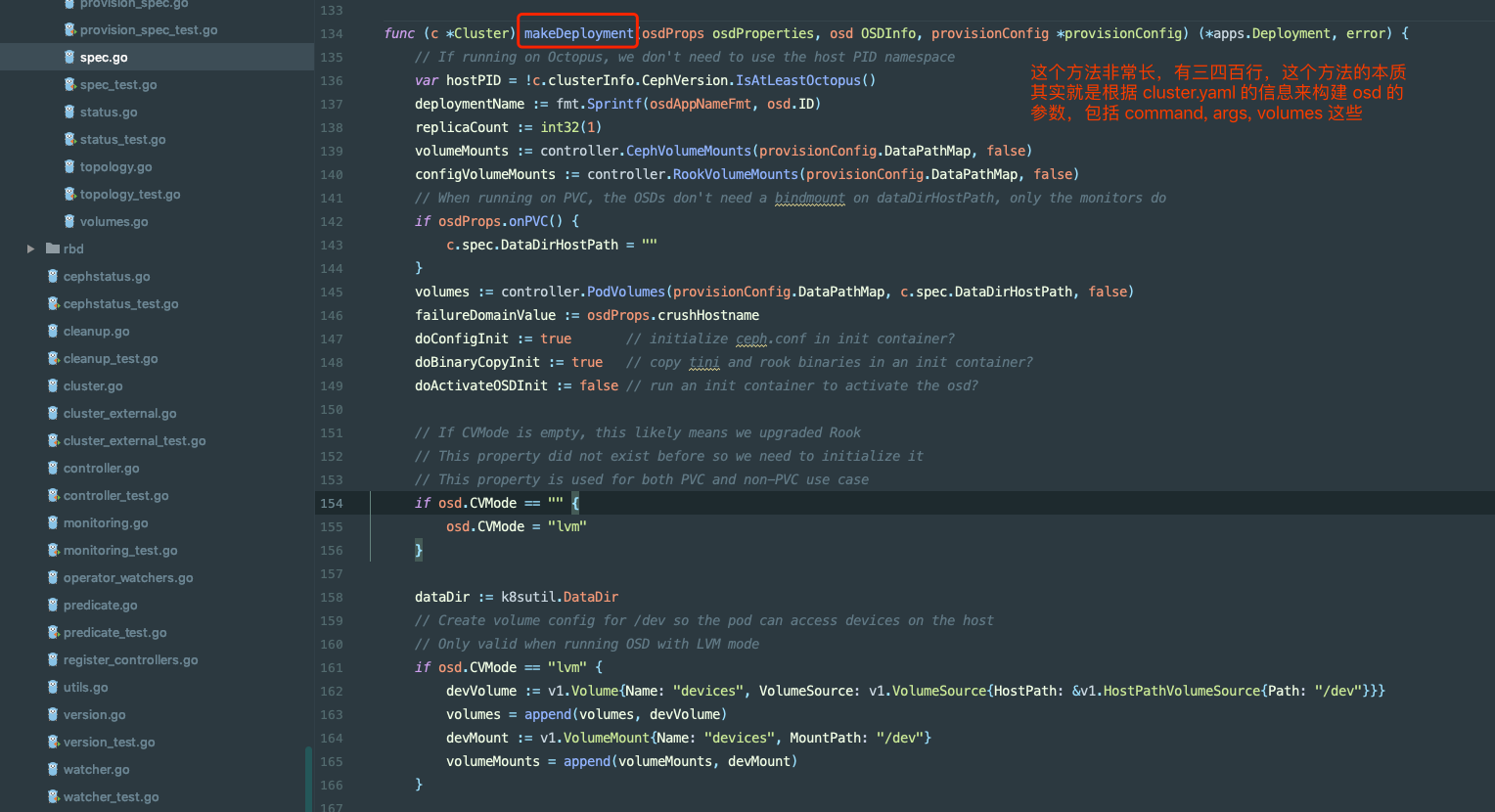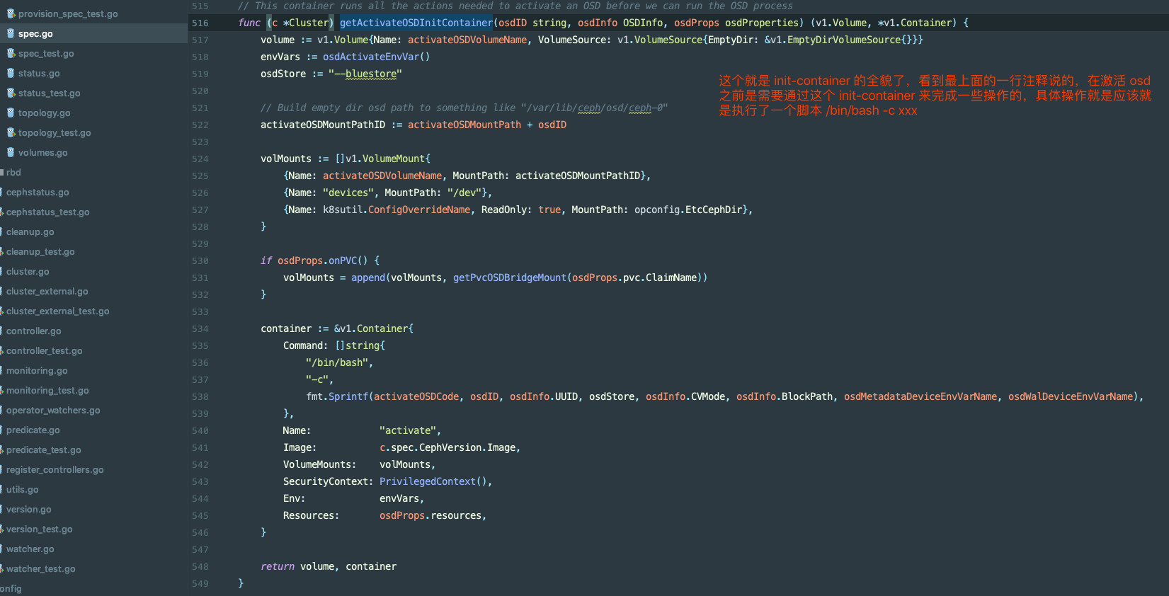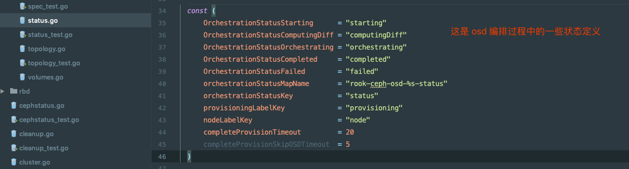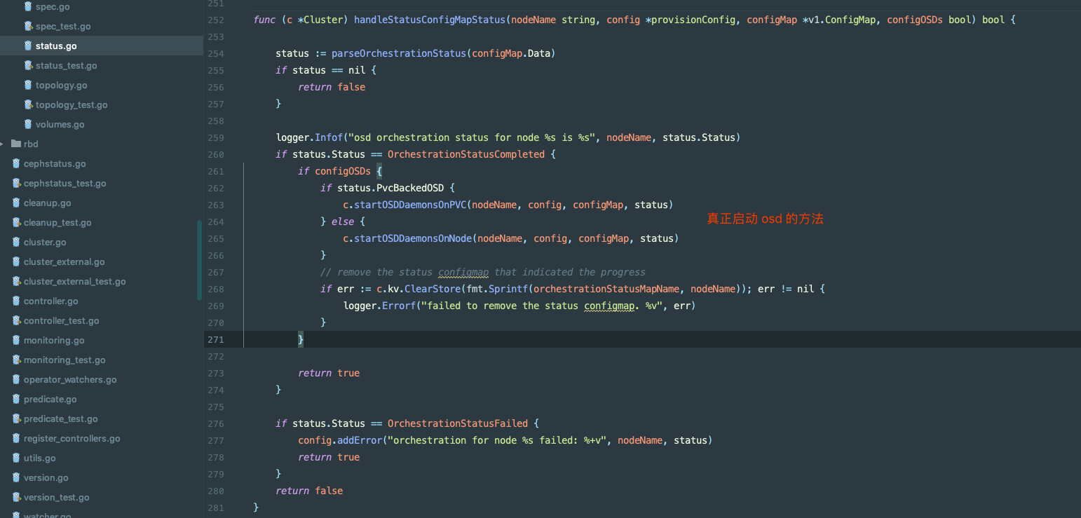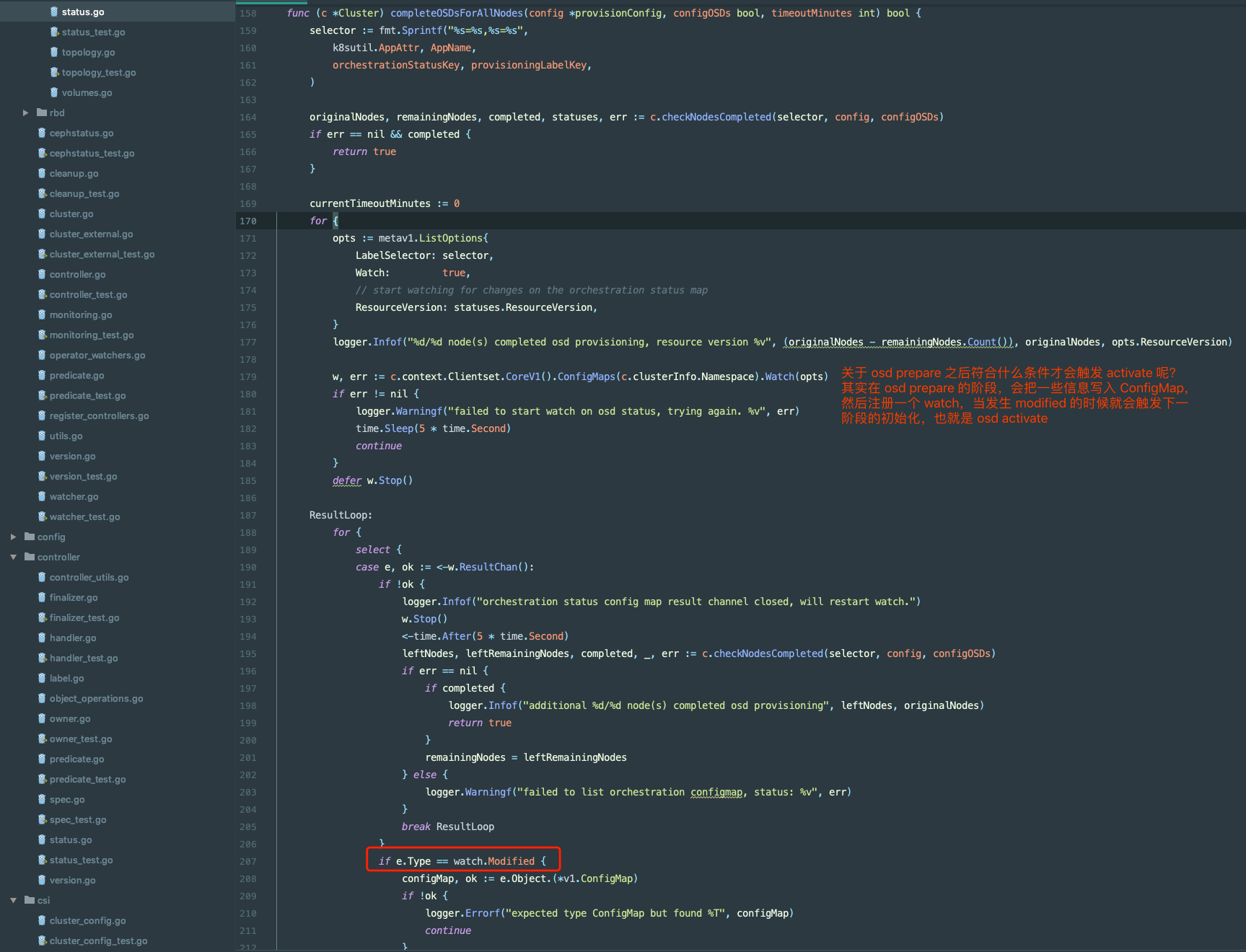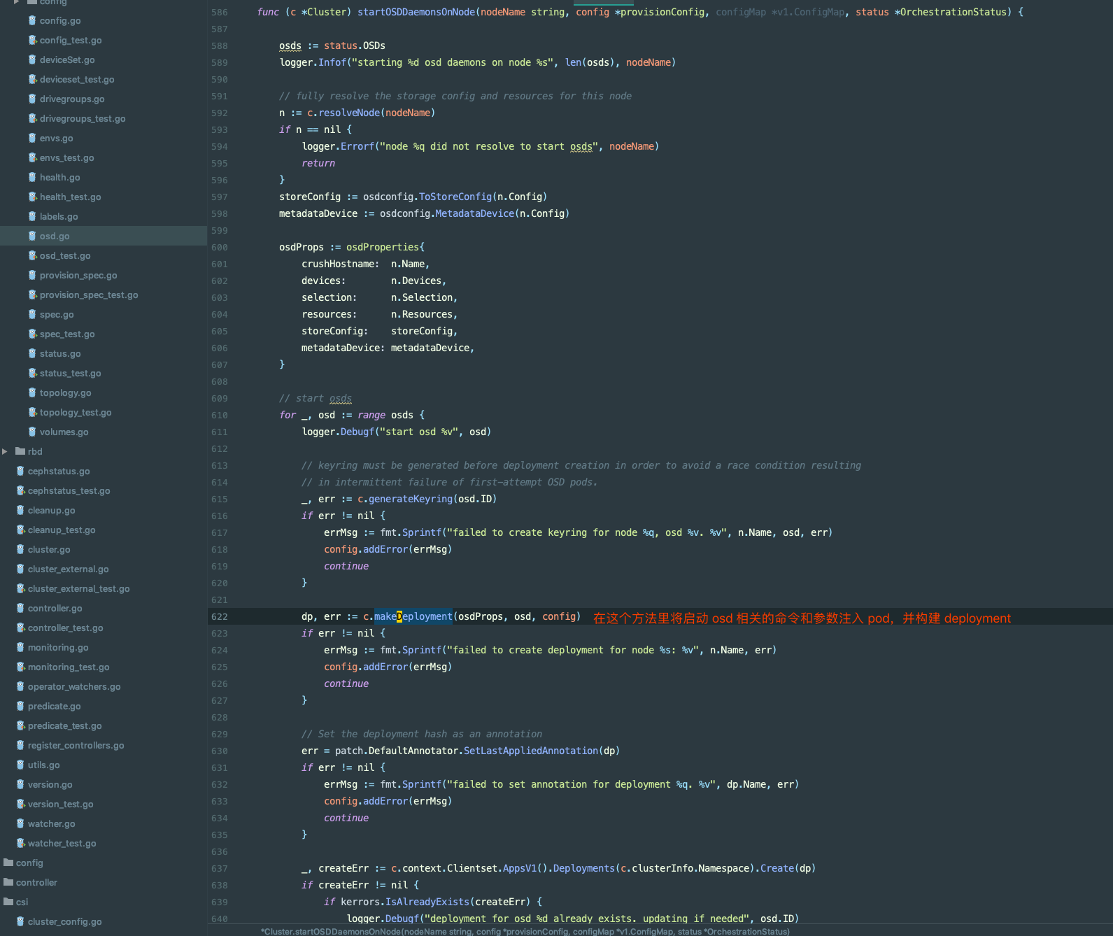 Rook 代码结构是比较清晰的,关于 osd 的代码可以从 pkg/operator/ceph/cluster/osd