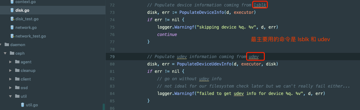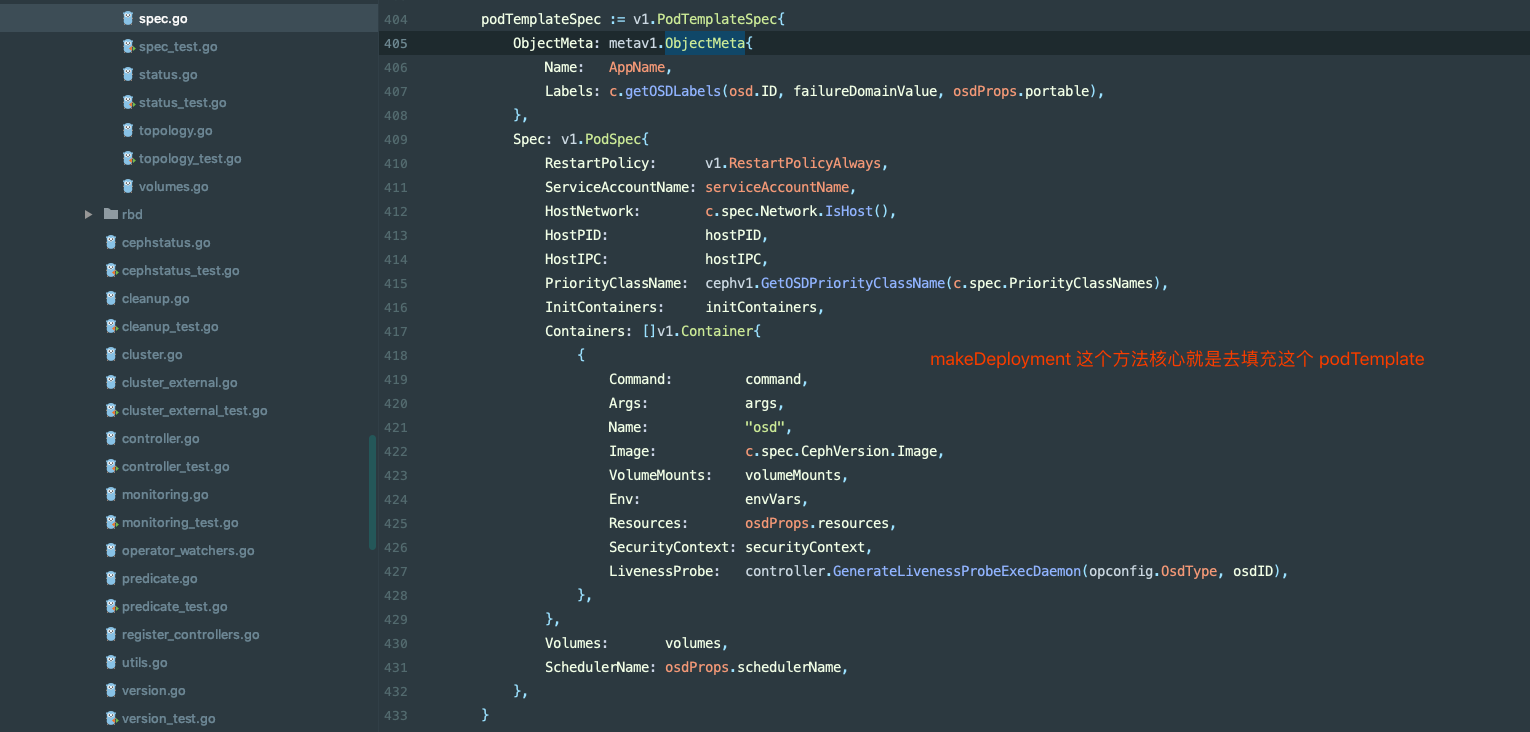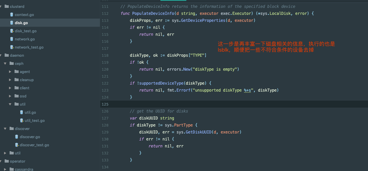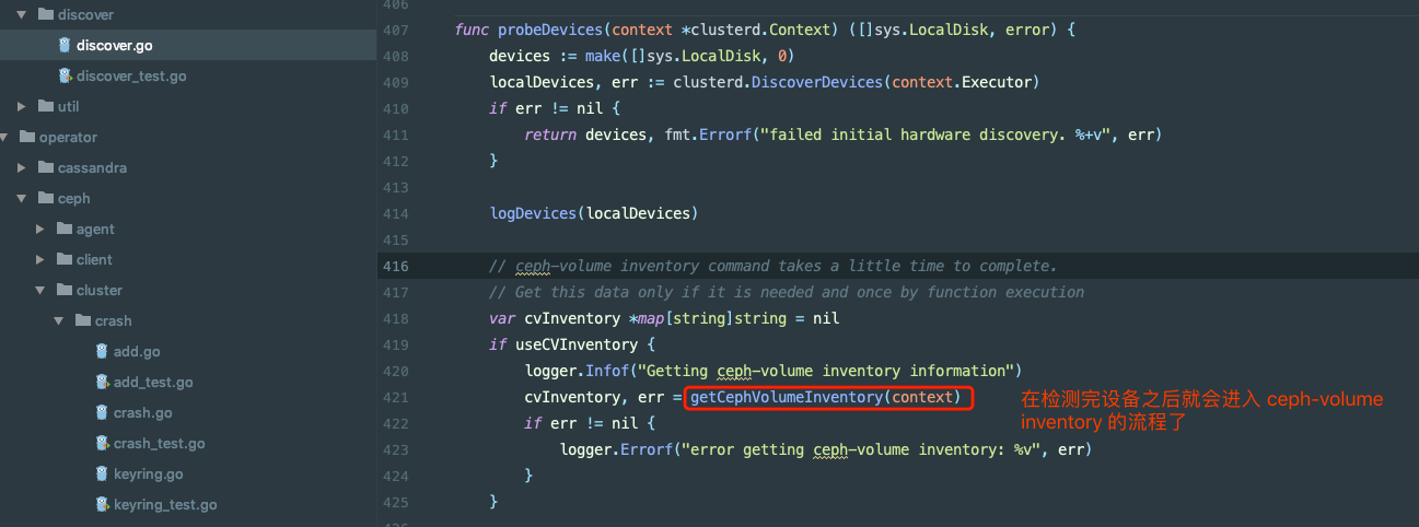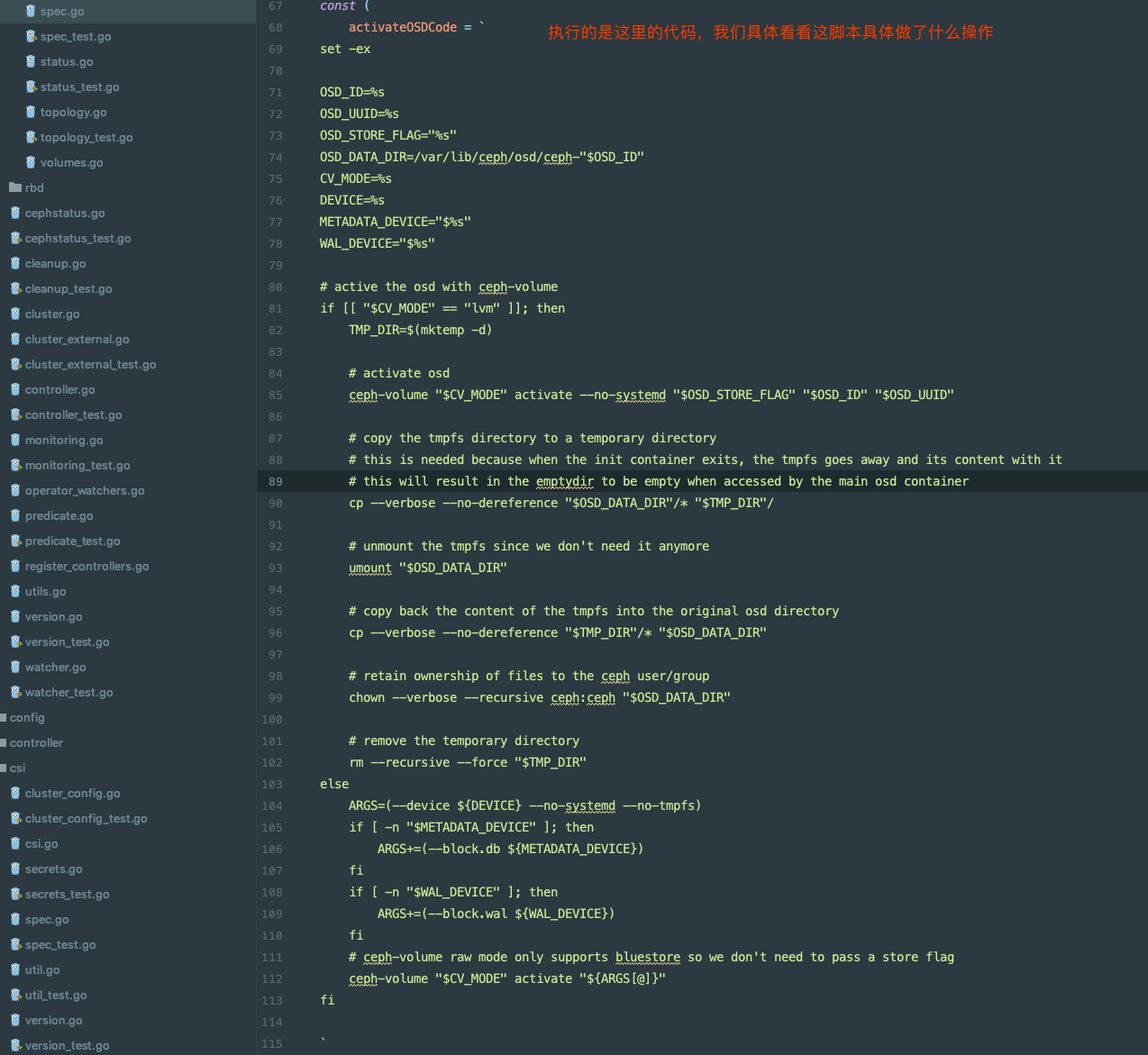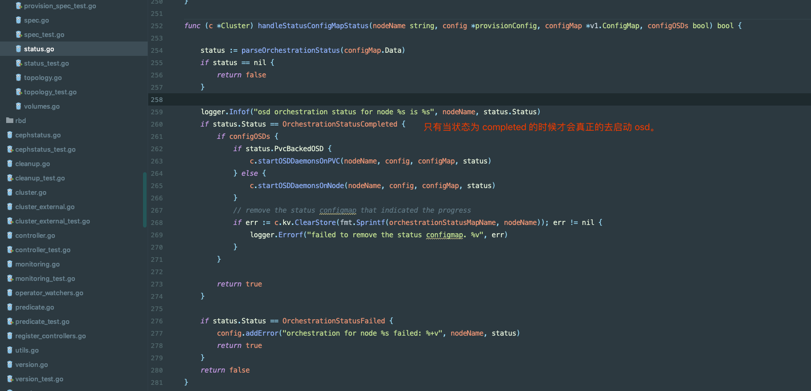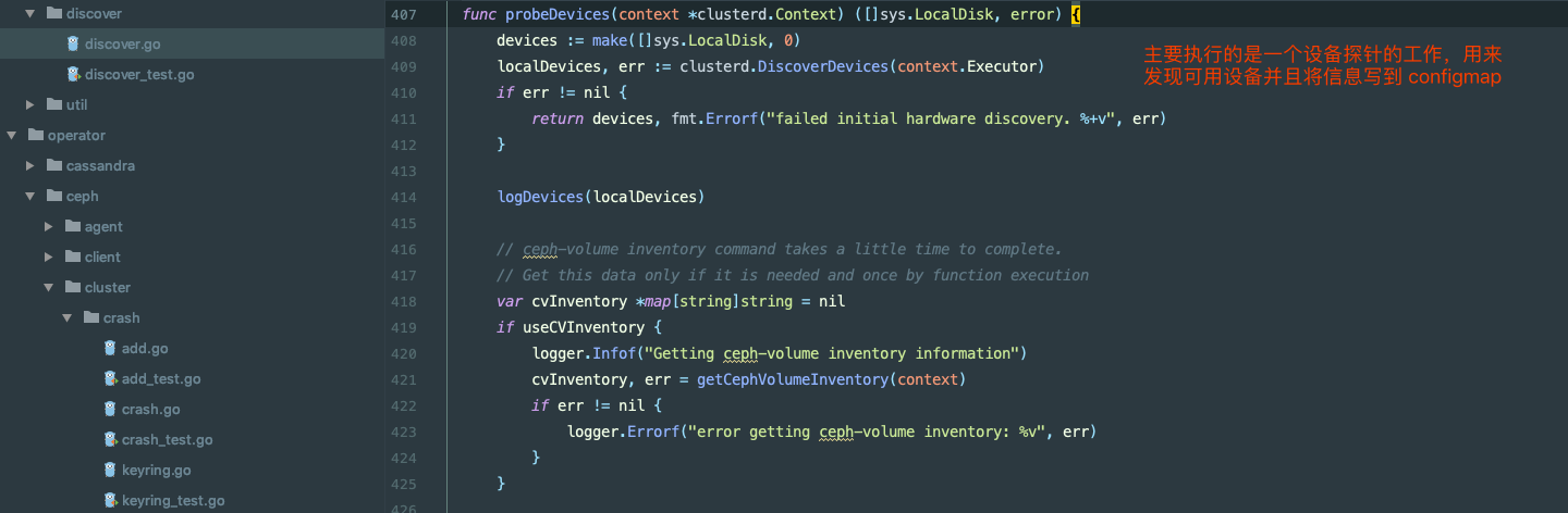 Rook 代码结构是比较清晰的,关于 osd 的代码可以从 pkg/operator/ceph/cluster/osd