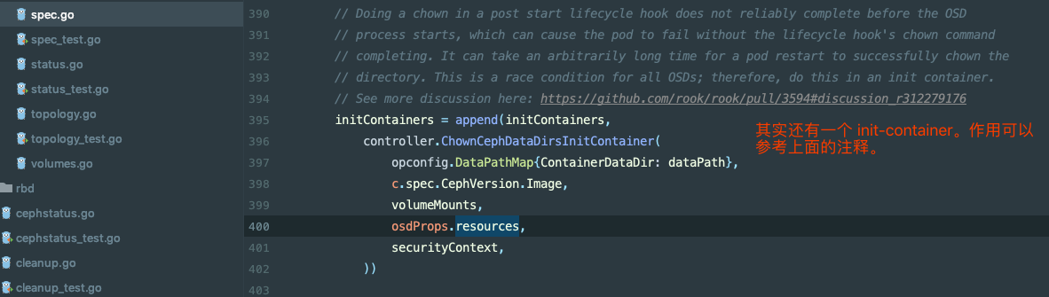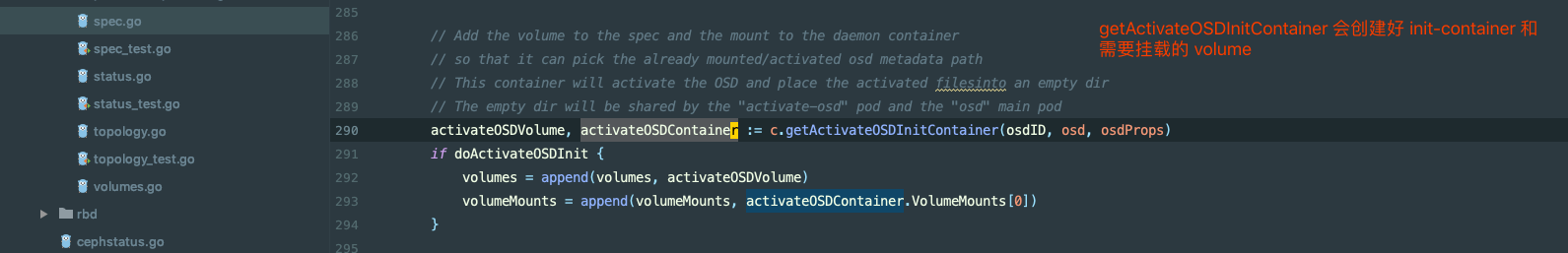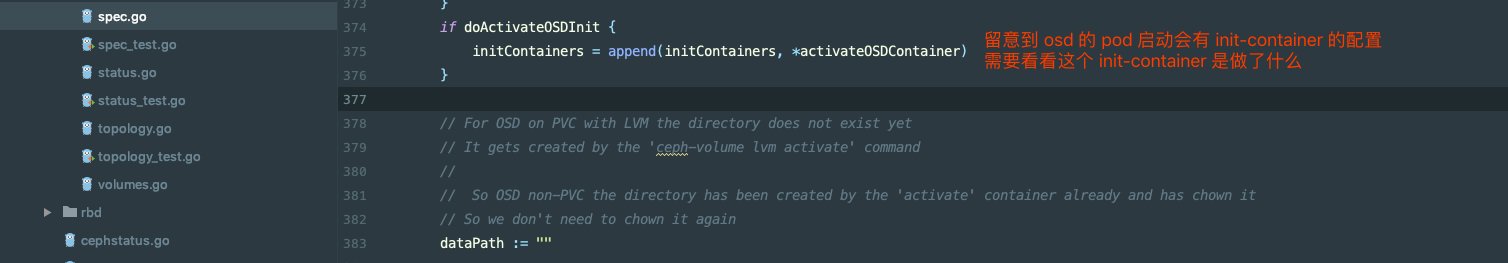 由于有一个 osd prepare 的过程,在 Rook 里是通过 init-container 来运行一个脚本来实现的。
