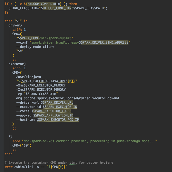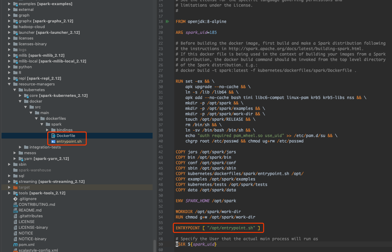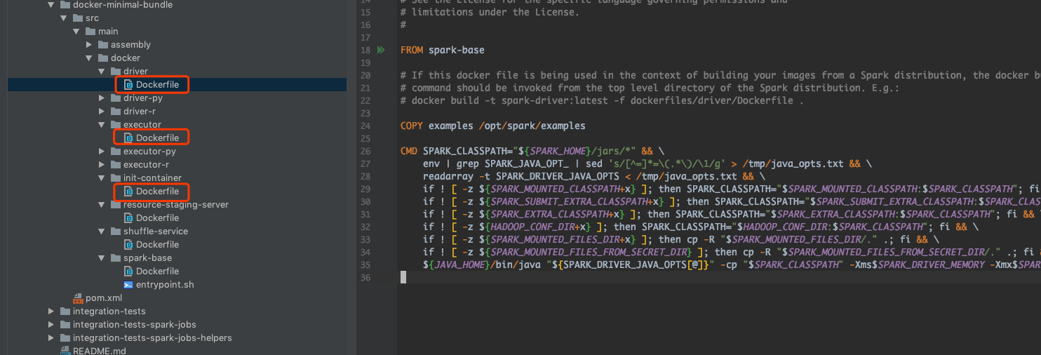 Spark 从 Spark 2.3.0 开始就统一了镜像,也就是说不会像 Spark2 那样分别提供 Driver/Executor/initContainer 的镜像。容器具体是启动哪个进程,由 entrypoint.sh 决定。